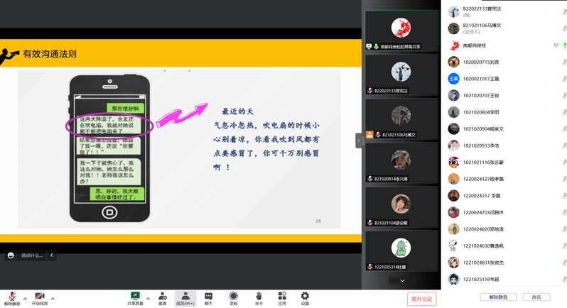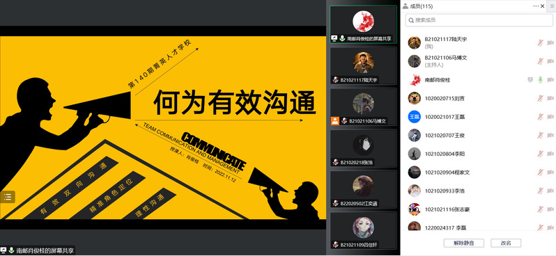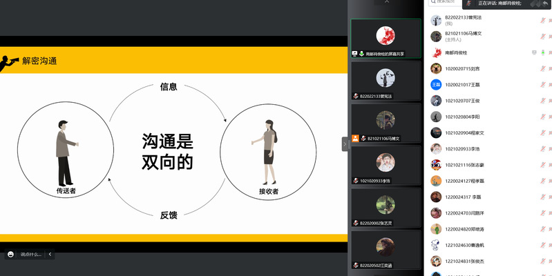 为提高同学们的职业素养,让同学们了解何为有效沟通,提升同学们有效双向沟通的能力,在生活和工作中更好地与人交流。11月12日晚,无码影片 承办的无码影片 第140期菁英人才学校举行第一次授课。本次授课围绕“有效沟通”展开,由电光院分团委书记肖俊桂担任主讲人,菁英人才学校全体学员于线上参会。