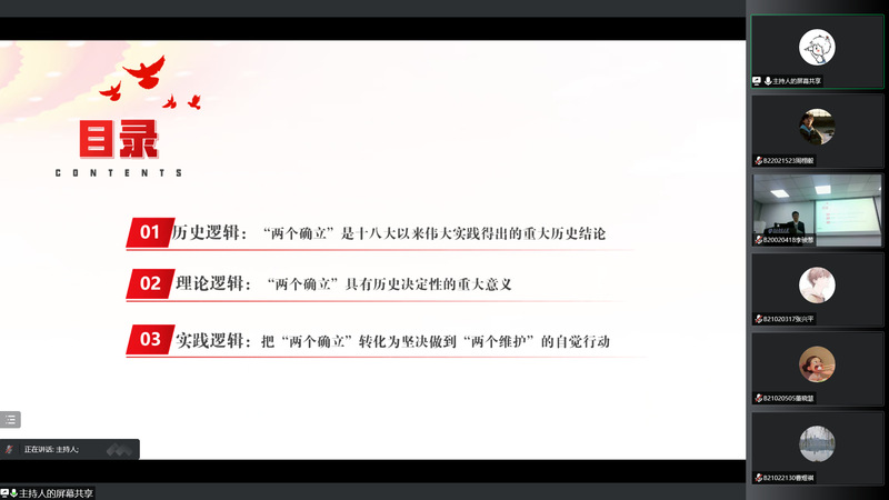 会议开始,无码影片 分团委书记肖俊桂老师介绍了本次会议的主要内容。随后,沈召前教授对党的二十大报告展开了深入讲解与剖析,介绍了党的二十大最重要的政治成果。沈教授认为,要保证这些政治成果和行动指南,最重要的是全党、全军、全国各族人民深刻把握“两个确立”,坚决做到“两个维护”。沈教授强调,“两个确立”是深刻总结党的百年奋斗历史经验、深刻总结党的十八大以来伟大实践得出的重大历史结论,是推进中华民族伟大复兴历史进程最根本的保证。把“两个确立”转化为坚决做到“两个维护”的自觉行动,要求我们思想上高度认同,政治上坚决忠诚。只有把“两个维护”作为党的政治建设的首要任务,才能形成万众一心的磅礴力量,才能应对国内外各种风险和考验,不断夺取中国特色社会主义事业新胜利。