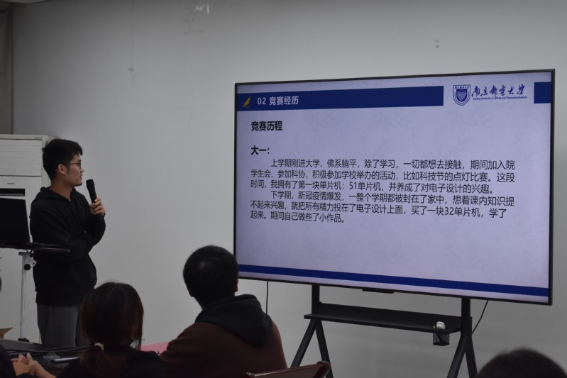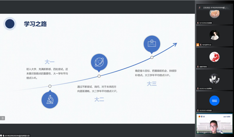 在25日的故事分享中,专业绩点第一,以一作发表多篇SCI论文的饶思思同学首先带来了自己的学习故事。她阐述了自己大学后从处于迷茫状态到找到学习目标方向的转变,用最终保研的结果向大家证明了及时找到适合自己的学习道路并为之努力的重要性。随后,曾任我院科协主席,荣获多项竞赛奖项的代军同学就各类竞赛的最佳参赛时间、比赛重点向大家进行了讲解,指导大家根据自身优势选择适合自己的竞赛项目。获得过一等奖学金、三好学生、校长嘉奖令以及多项国家级奖项的唐承乾学长重点就电子设计类竞赛向大家详细介绍了竞赛特色以及涉及保研的竞赛成就要求,鼓励同学与志同道合的同学共同研讨、齐力奋斗。