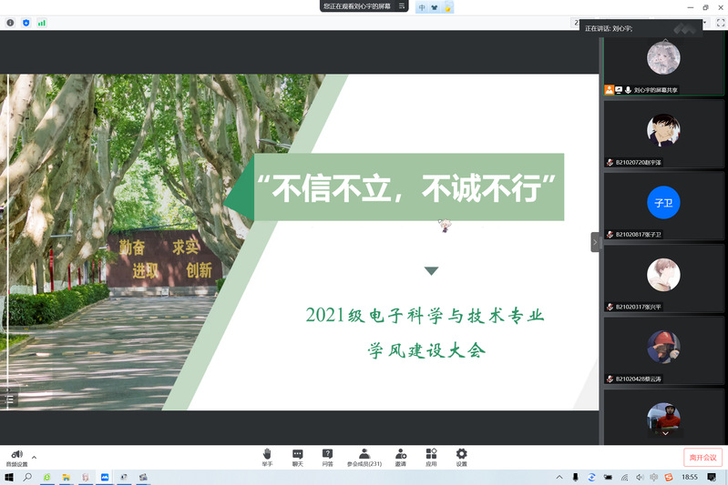 为了增强学生的诚信意识,提高学生的道德素养,12月13日晚,无码影片 2021级电子科学与技术专业开展“不信不立,不诚不行”诚信主题学风建设大会。本次大会由辅导员刘心宇主持,采用线上方式开展,2021级电子科学与技术专业全体学生参加。