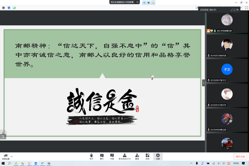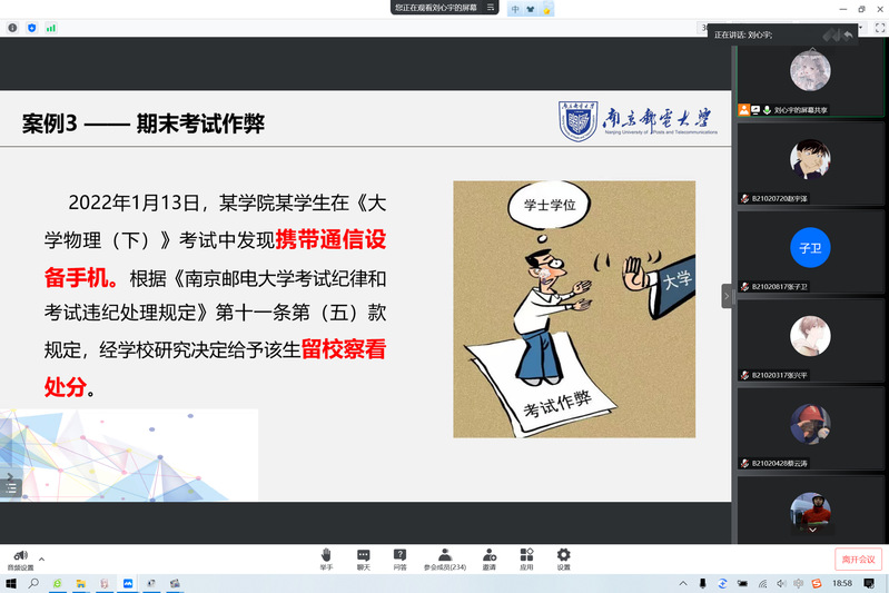 大会伊始,辅导员刘心宇从南邮精神的内涵切入,告诉同学们“信达天下,自强不息”中“信”其中亦有诚信之意,勉励同学们南邮人要以良好的信用和品格享誉世界。刘心宇老师通过讲述相关案例,和同学们深入探讨了考试中不可触碰的“底线”,并希望同学们在考试中以诚为本。随后,刘心宇老师强调了在有疫情的当下,要承担诚信的基本责任,不信不立,不诚不行。
