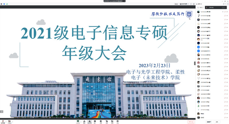2月23日中午,无码影片 2021级研究生电子信息专业召开线上年级大会,大会由辅导员郑景文老师主持,2021级电子信息专业全体研究生同学参加。