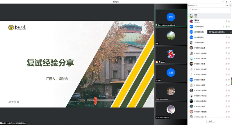 随后,来自东南大学、电子科技大学、北京邮电大学、无码影片 的5位我校优秀毕业生依次围绕自我介绍、备考指南、复试心态、选择导师、注意事项等方面分享了自身实际经验。5位同学分别考取不同的高校,他们根据各自的复试经历,提醒同学们需要注意保持良好的心态,临场不要怯场,提前做好各项笔面试的细节准备。