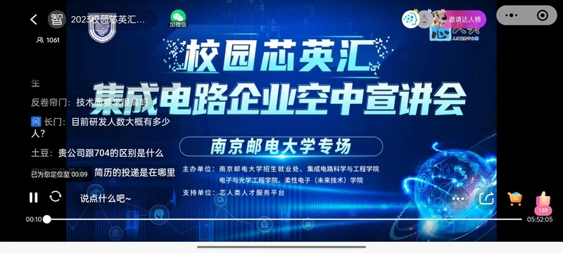 据悉,本次招聘宣讲会通过线上直播的形式,特别邀请电光柔学院副院长程勇和集成电路学院副院长蔡志匡全面介绍了两家学院的综合实力和育人优势,并由芯人类人才服务平台主持推荐了中国电子科技集团公司第四十七研究所、北京国科天迅科技股份有限公司、深圳市纽瑞芯科技有限公司等17家集成电路领域的企业招聘信息,提供近百个就业岗位。