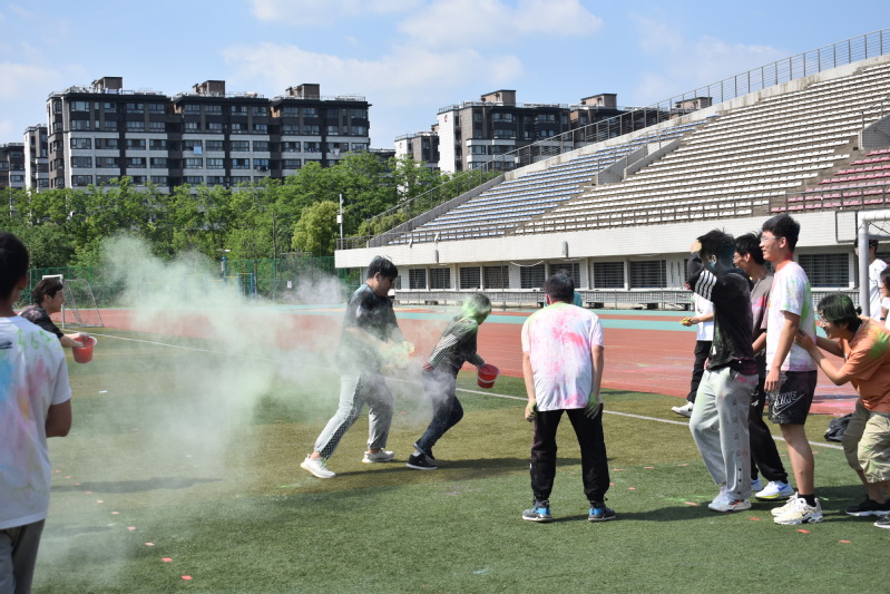 此外,现场还有“跳房子”和“手印彩绘”活动,以及荧光棒、泡泡水、小风车、纸飞机、竹蜻蜓等小玩具,同学们还在比赛结束后尽情挥洒彩粉,寻回儿时的记忆, 重温童年的简单快乐。