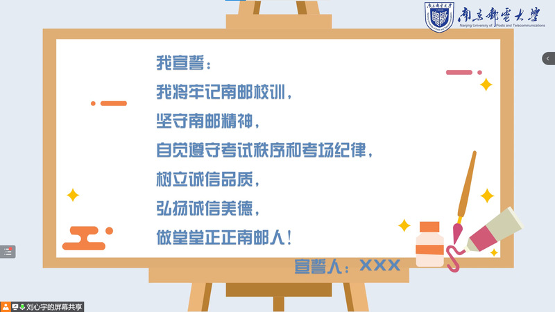 大会最后,刘心宇老师引领同学们进行了诚信考试的宣誓,激励同学们牢记南邮校训,坚守南邮精神,弘扬诚信美德,做堂堂正正南邮人。并希望各位同学能锤炼自身品德修为,坚定信念,奋力拼搏,考出理想的成绩。