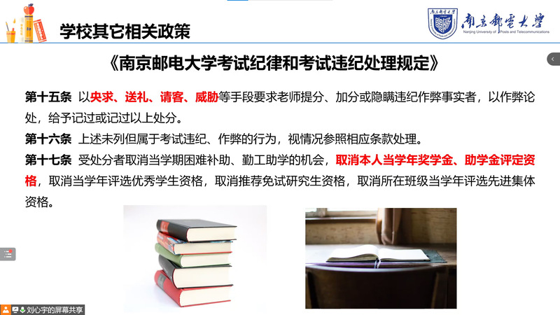 会上,刘心宇老师向同学们阐明了诚信考试的意义。“人无信则不立”,诚信,是一种责任,一种美德,一种力量。接着,刘老师介绍了考试相关政策章程,强调了国家、学校对诚信考试的高度重视。接着,刘老师结合案例为同学们详细介绍了我校关于考试作弊处罚的相关规定,明确了我校对考试作弊“零容忍”“零放纵”的处理态度,她叮嘱同学们在考前认真复习,尽己所能,切勿投机取巧,追悔莫及。