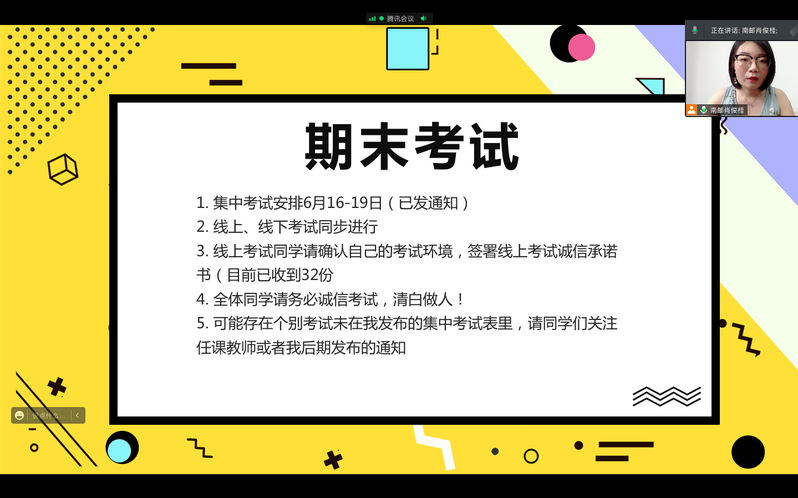 临近期末,肖老师首先就近期期末考试表达对同学们的鼓励和期望,祝愿同学们能在此次考试中取得好成绩,同时也向同学们强调了考试的纪律性,要求全体同学杜绝作弊,诚信考试。接着肖老师布置了关于今年暑期社会实践的相关工作,并指出学院将开展暑期社会实践专项培训,为同学们更好地参与和完成社会实践提供助力,使同学们在实践中强信仰、学真知、长才干!